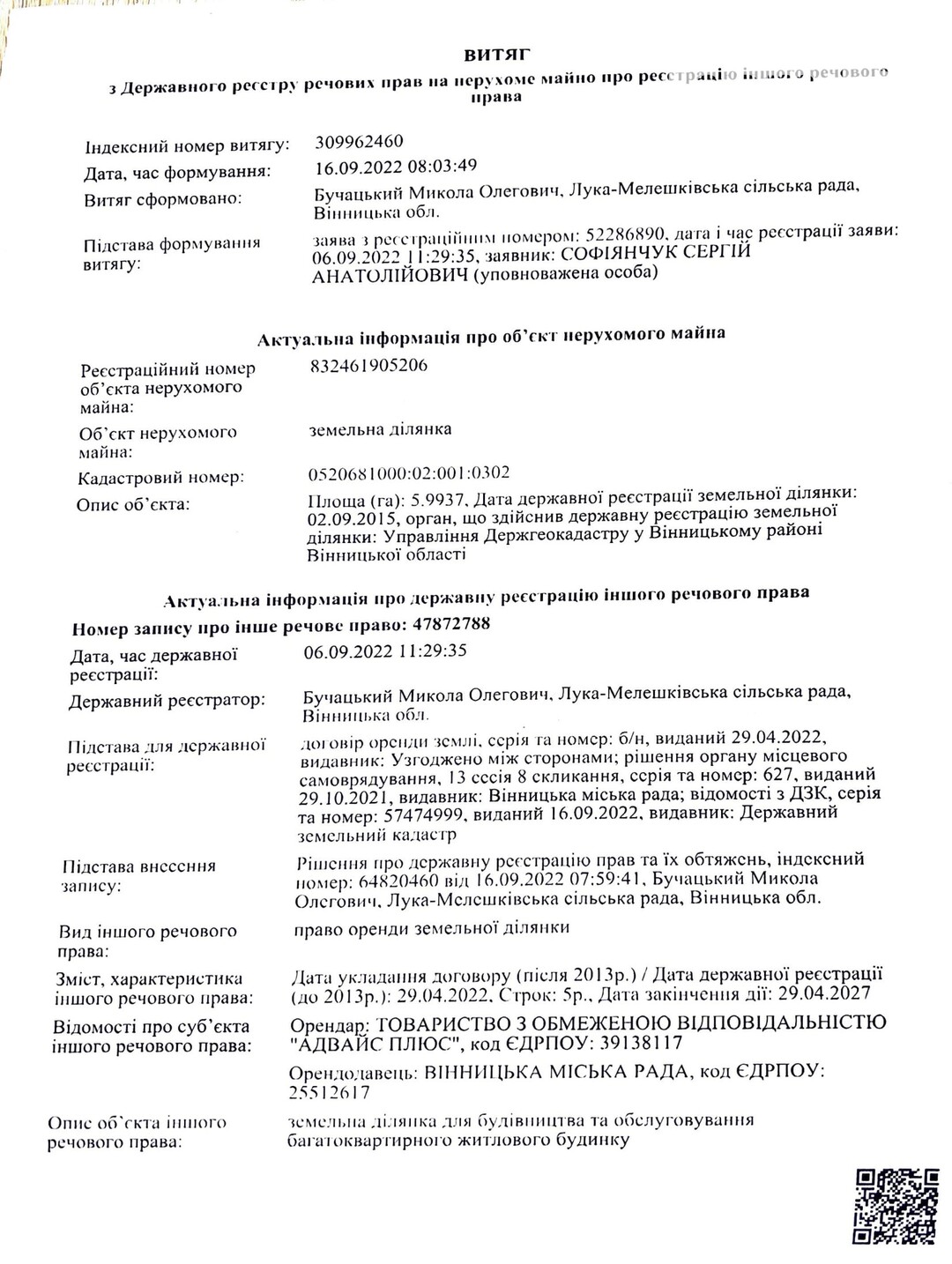 Документи на землю Витяг з Державного реєстру речових прав на нерухоме майно 309962460 |