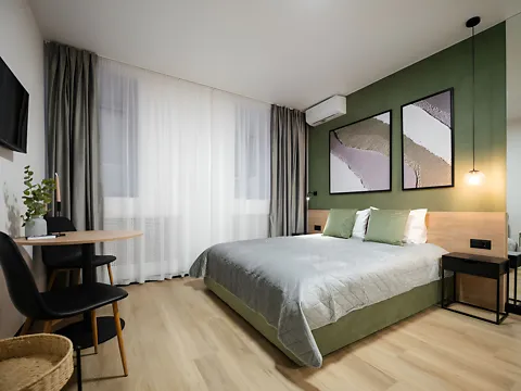 Квартира має двоспальне ліжко з якісним матрацом, що забезпечує спокійний та комфортний сон. Також є два кресла для відпочинку впродовж дня.