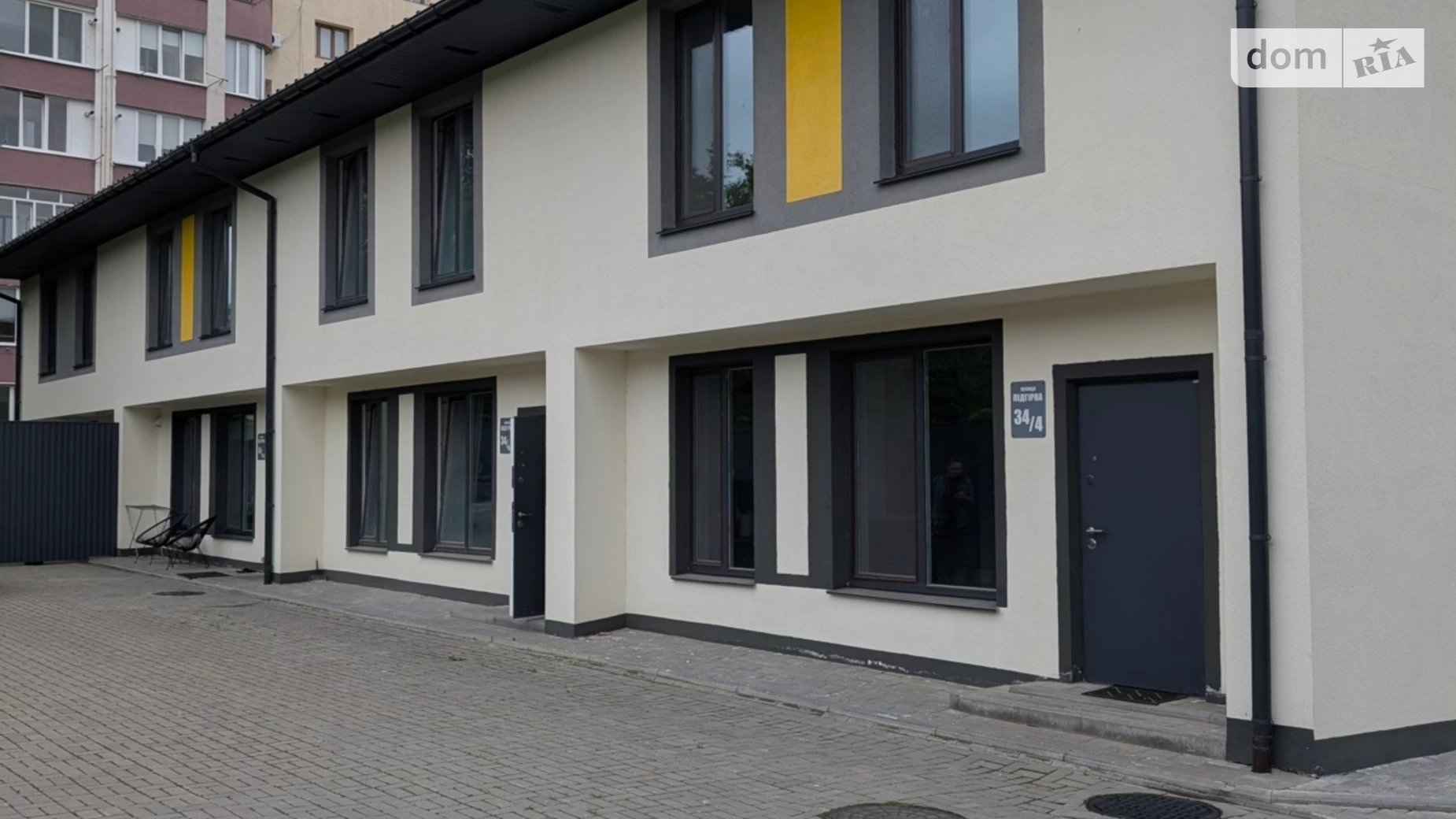 Фасад виконаний у сучасному стилі: поєднання декоративної деревяної текстури, світлих акцентів та темних віконних профілів. Перед будинком облаштована вимощена бруківкою територія з місцями для паркування.