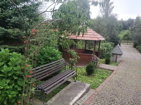 На подвір'ї є альтанка, ставок, сад з фруктовими деревами і кущами з ягодами та город.