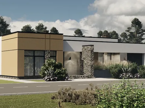 Цікаве архітектурне рішення цього будинку тим, що має два крила. В правому крилі ми маємо гостьове рішення, а саме вітальня, гардеробна, вбиральня з ванною та велика кухня з твердопаливним котлом. Якщо піднятись на другий поверх то там є дворівнева спальня.