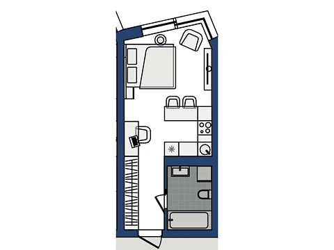 Загальна площа 22 м², кухня 5 м². Для більшого простору облаштовано великий добудований балкон, що виходить у тихий двір.