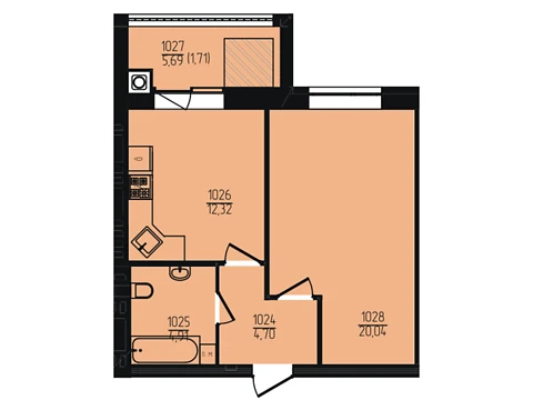 Площа 1-кімнатної квартири - 55.28 м². Квартира розташована на 5 поверсі 15-и поверхового будинку.