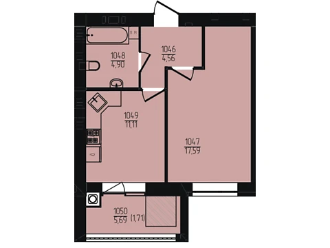 Площа 1-кімнатної квартири - 43.36 м². Квартира розташована на 10 поверсі 9-и поверхового будинку.