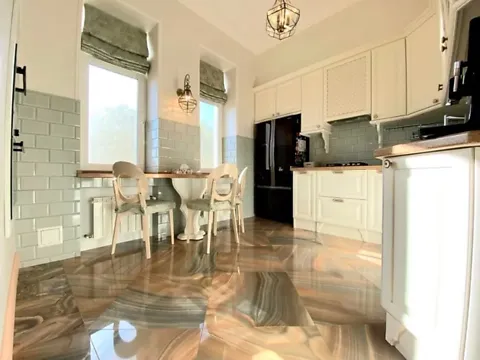 Цегляний будинок збудований у 1939 роках («сталінський» період забудови), проте не є типовим проєктом того часу. В квартирі виконаний капітальний ремонт з заміною  всіх інжинерних мереж та комунікацій,      дизайн квартири виконаний по авторському проекту . Просторе планування, великі світлі кімнати загальна площа 101 кв.м.: спальня-14.25, дитяча кімната з гардеробом-20.1кв.м., кабінет-11.92, вітальня -24.24 кв.м, та кухня-10кв.м .  висота стелі -3.1м .  Квартира укомплектована меблями , вбудованими  кухонними  меблями та побутовою технікою, на підлогах паркетна дошка в кімнатах, та плитка з підогрівом у коридорі, кухні, та ванній кімнаті. Кондиціонери у кожній кімнаті. Над квартирою  горище з ремонтом,  як повноцінний поверх. Проведа заміна даху .В квартирі охоронна сигналізація, відеонагляд . Тихий зелений двір, поряд бассейн, стадіон, магазини, ресторани, відділення банків, лікарні. Поруч автостоянка.