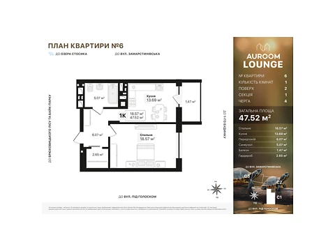 Сучасне планування площею - 47.52 м² створене саме для комфорту і затишку.
