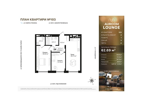 Це комфортне планування 2-кімнатної квартири з зонами для дозвілля та роботи. Площа 2-кімнатної квартири - 62.68 м².