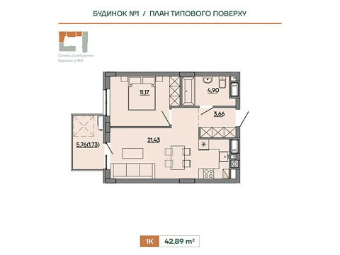 Це комфортне планування 1-кімнатної квартири з зонами для дозвілля та роботи. Площа 1-кімнатної квартири - 47.61 м².