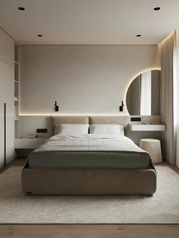 Спальня: ліжко з матрацом, туалетний стіл, пуф, тумбочки - Frankoff; вбудована гардеробна шафа; штори блекаут; телевізор Sony. Підлога - плитка; покриття стін - фарба італійського виробника.