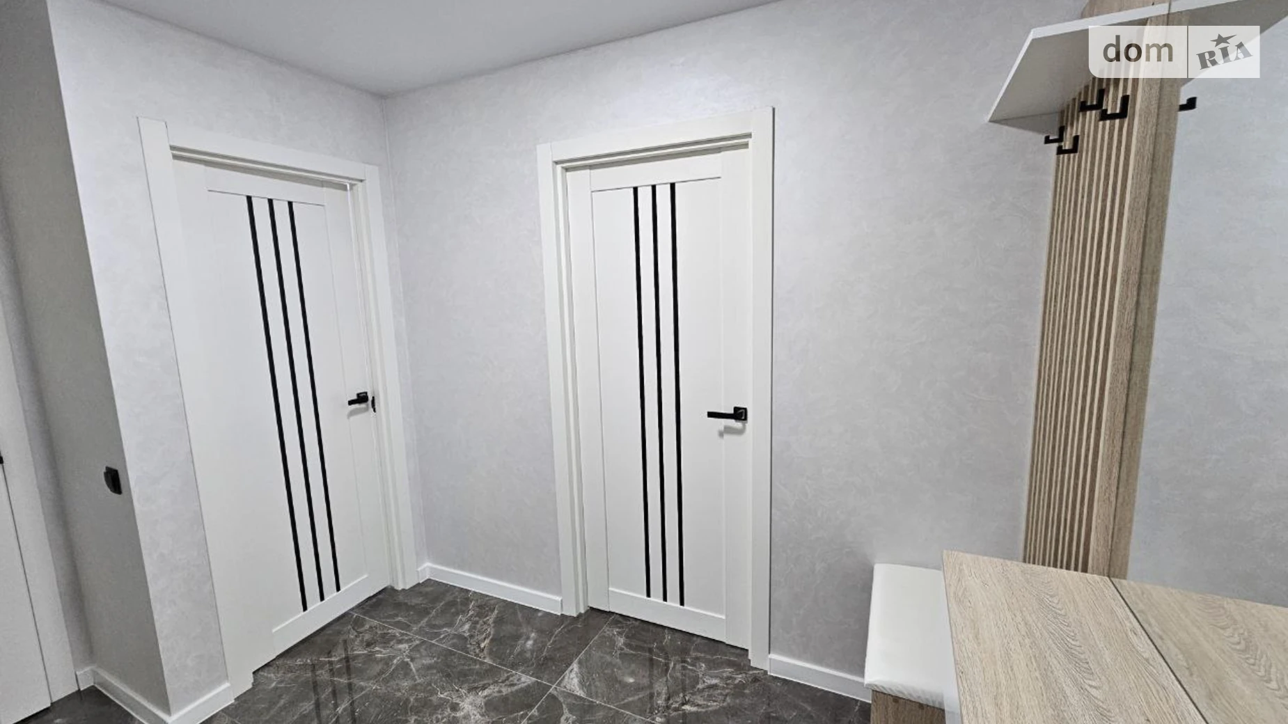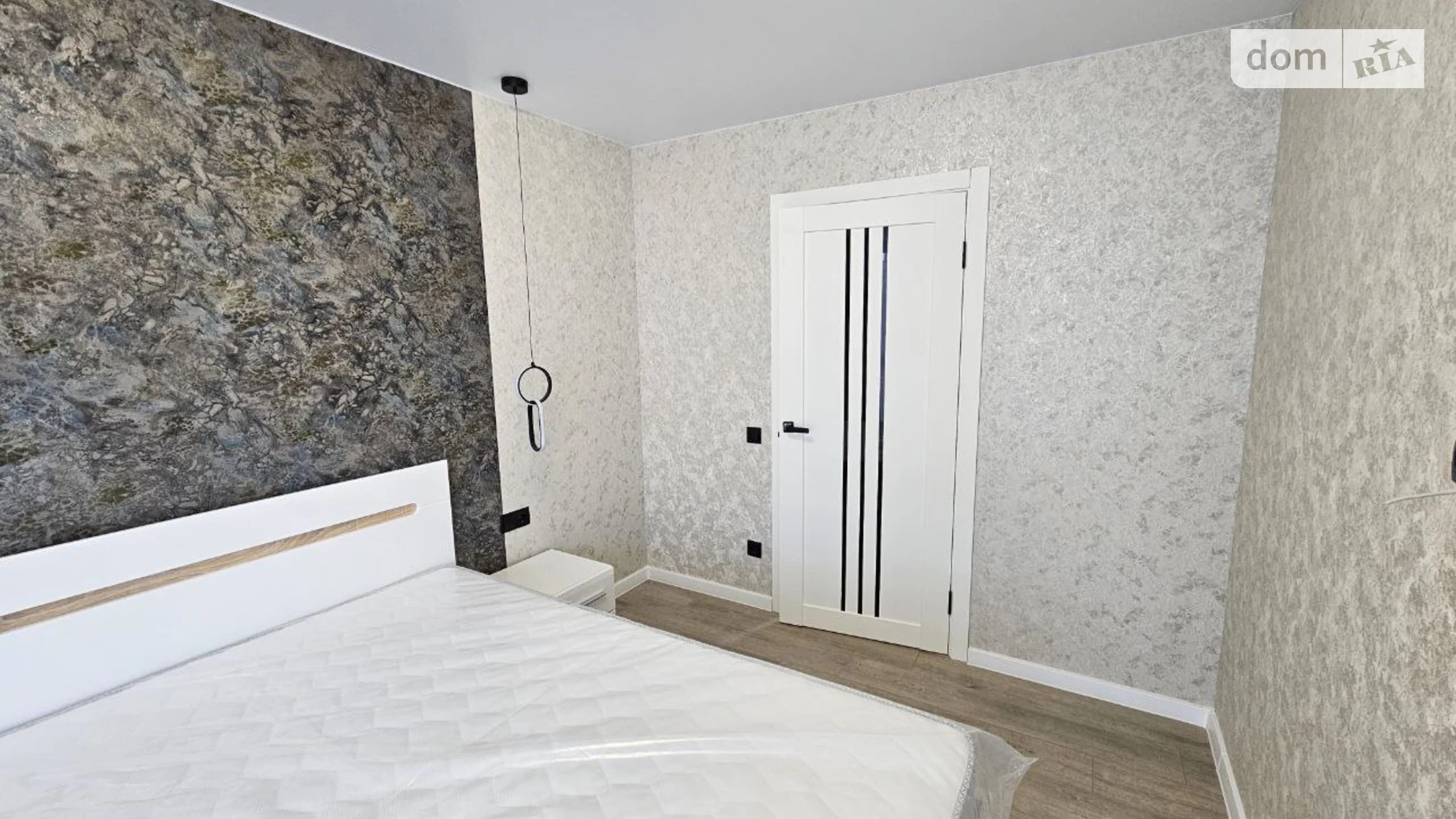 Квартира має зручне планування: простора спальня з великим ліжком, сучасним освітленням і місткою шафою для зберігання речей. У коридорі також передбачена додаткова шафа.