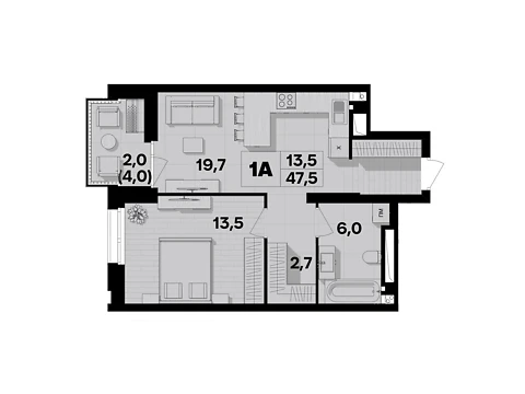Площа 1-кімнатної квартири - 47.5 м². Квартира розташована на 2 поверсі 20-и поверхового будинку.