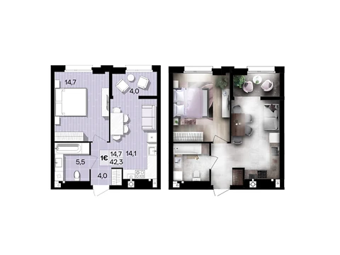 Площа квартири 42, 7 м2, кухня-студія, житлова кімната правильної форми, суміжний санвузол.