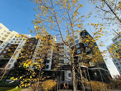 Велика, сучасна прибудинкова територія, закритого типу. На територї є все, необхідне для комфортног опроживання: сепермаркети, магазини, сучасні дитячі площадки.