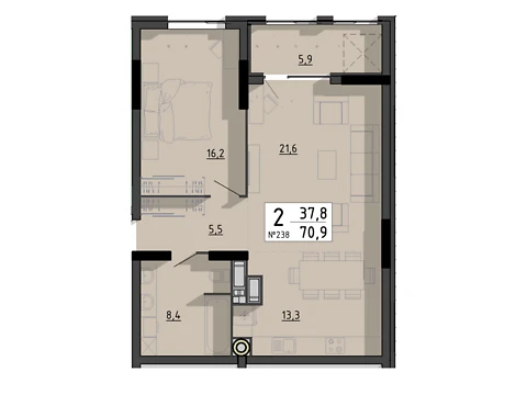 Це комфортне планування 2-кімнатної квартири з зонами для дозвілля та роботи. Площа 2-кімнатної квартири - 70 м².