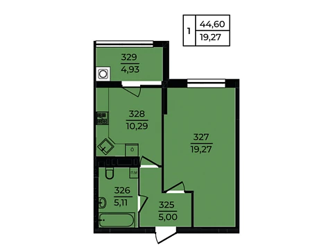 Це комфортне планування 1-кімнатної квартири з зонами для дозвілля та роботи. Площа 1-кімнатної квартири - 44.7 м².
