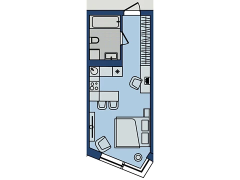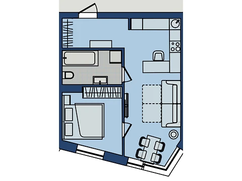 Це комфортне планування 1-кімнатної квартири з зонами для дозвілля та роботи. Площа 1-кімнатної квартири - 28.29 м².