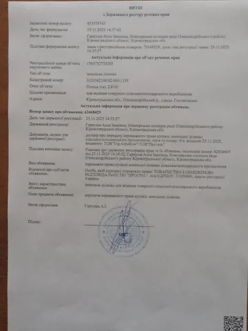Продаж земельної ділянки загальною площею 2.8181 га, кадастровий номер 3520382100:02:000:1139, адреса: Кіровоградська область, Олександрійський район,