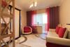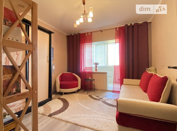Кімната з шафою та розкладним диваном, має засклений балкон. Косметичний ремонт в світло-коричнових тонах.