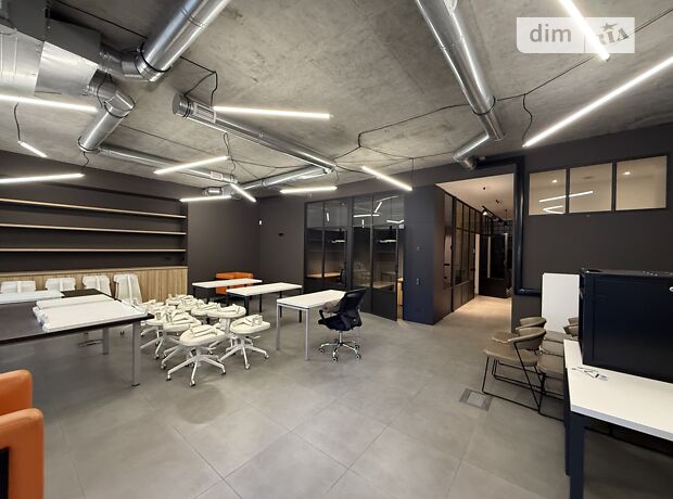 Офіс зі свіжим ремонтом в стилі лофт. Розпланований на: кухню, коридор, 2 санвузли - один з душем; декілька окремих кабінетів - переговорних або т.п.; великий кабінет формату "open-space" з виходом на відкритий балкон.