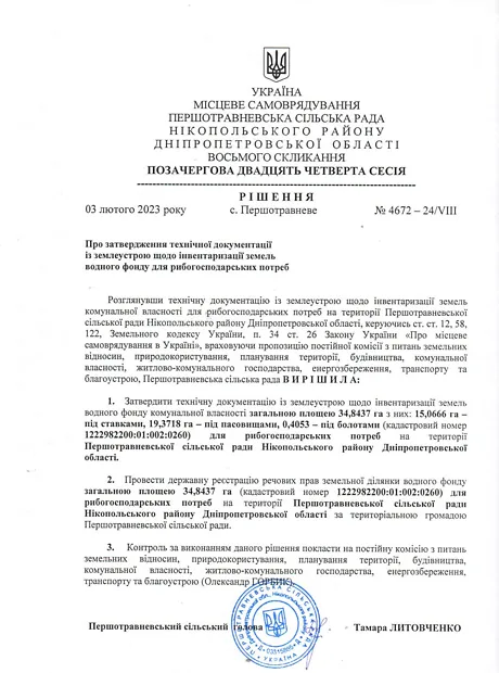 - Оренда земельної ділянки водного фонду, площа 34,8437 кадастровий номер 1222982200:01:002:0260. цільове призначення для рибгосподарських потреб, вид угідь - ставки площа 15,0666, пасовища - площа 19,3718 га. болота площа - 0,4053. Розташовані за мезами населиного пункт с. Чистопіль, Нікопольський район, Дніпропетровської області Мозолевської сільської ради.