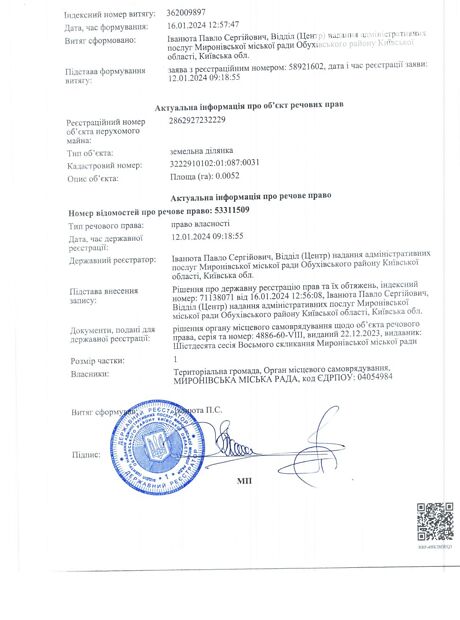- Кадастровий номер 3222910102:01:xx7:0xxx
