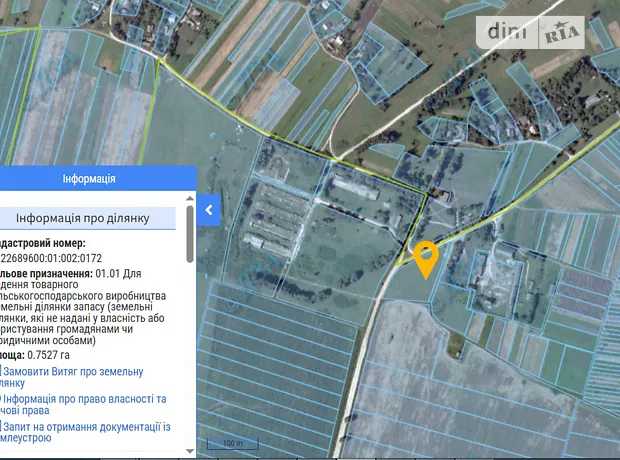 - Земельна ділянка для ведення товарного сільськогосподарського виробництва площею0,7527 га, кадастровий номер 6122689600:01:002:0172, (землі під сільськогосподарськими та іншими господарськими будівлями і дворами) за межами населеного пункту, село Чистопади Тернопільського району Тернопільської області
