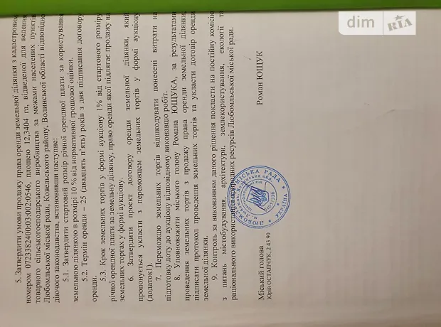 - Продаж права оренди земельної ділянки сільськогосподарського призначення, площею 12.3404 га. кадастровий номер: 0723382400:03:002:0546, що розташована на території Любомльської міської ради, Ковельського району, Волинської області, категорія земель – землі сільськогосподарського призначення, вид цільового призначення – для ведення товарного сільськогосподарського виробництва.