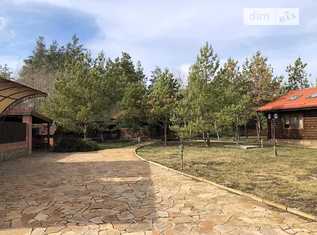 По всій ділянці ландшафтний дизайн. Навколо сосновий ліс.