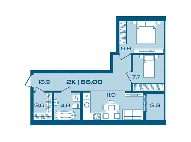 Це комфортне планування 2-кімнатної квартири з зонами для дозвілля та роботи. Площа 2-кімнатної квартири - 66 м².