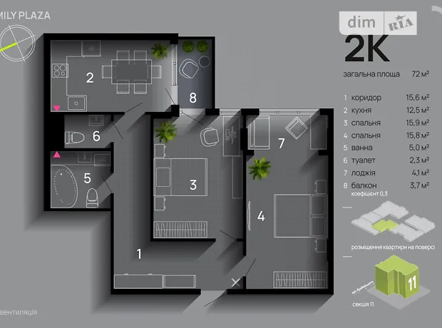 - Загальна площа 72 м² · житлова 32 м² · кухня 12.5 м²