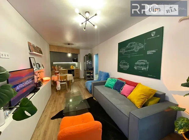 - Простора кухня-вітальня з вбудованою кухнею, затишним диваном і яскравими деталями створює комфортний простір для відпочинку.