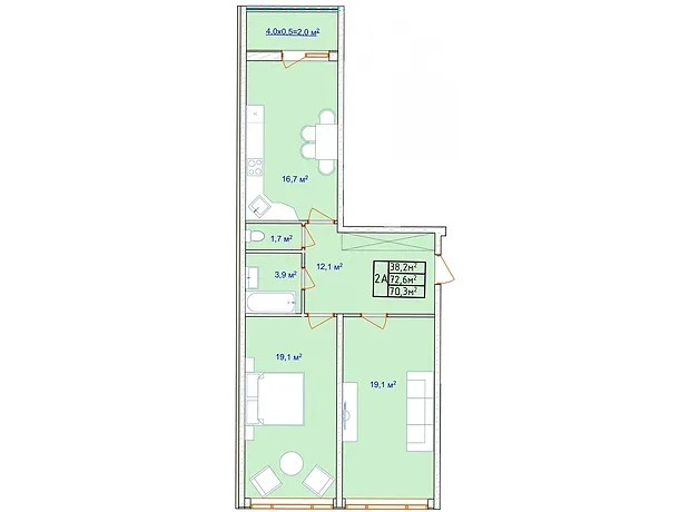 - Загальна площа 72.5 м²