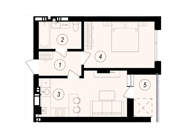 Це комфортне планування 1-кімнатної квартири з зонами для дозвілля та роботи. Площа 1-кімнатної квартири - 43.95 м².